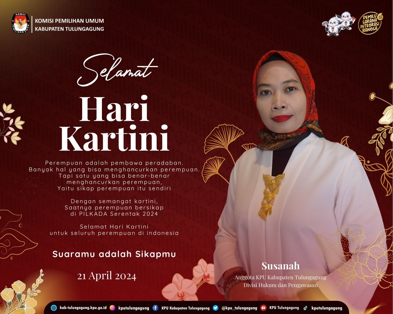 Tulungagung (kab-tulungagung.kpu.go.id) - Pada peringatan Hari Kartini, 21 April 2024 Anggota Komisi Pemilihan Umum Kabupaten Tulungagung, Susanah mengingatkan tentang kutipan dari Ibu Kartini yakni "Perempuan adalah pembawa peradaban", sebuah simbol dari perjuangan dan pembuktian bahwa perempuan mampu melakukan banyak hal. "Banyak hal yang bisa menghancurkan perempuan, tapi satu yang bisa benar-benar menghancurkan perempuan, yaitu sikap perempuan itu sendiri. Dengan semangat kartini, Saatnya perempuan bersikap di Pilkada Serentak 2024" ujar Susanah. Susanah menambahkan bahwa saat ini perempuan lebih bebas untuk bekspresi dan pendapat maka jangan menyiakan kesempatan tersebut dengan pasif apalagi sampai tidak menggunakan hak pilihnya dengan bijak pada Pilkada 2024. "Selamat Hari Kartini, untuk seluruh perempuan di Indonesia Suaramu adalah Sikapmu" terang Susanah