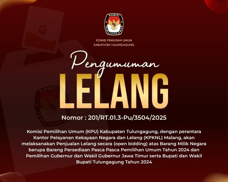 Komisi Pemilihan Umum (KPU) Kabupaten Tulungagung, dengan perantara Kantor Pelayanan Kekayaan Negara dan Lelang (KPKNL) Malang, akan melaksanakan Penjualan Lelang secara (open bidding) atas Barang Milik Negara berupa Barang Persediaan Pasca Pasca Pemilihan Umum Tahun 2024 dan Pemilihan Gubernur dan Wakil Gubernur Jawa Timur serta Bupati dan Wakil Bupati Tulungagung Tahun 2024 berupa 1 (satu) Paket Barang Persediaan Pasca Pemilihan Umum dan Pemilihan Tahun 2024 yang terdiri dari Surat Suara Pemilihan Gubernur dan Wakil Gubernur Jawa Timur Tahun 2024, Surat Suara Pemilihan Bupati dan Wakil Bupati Tulungagung Tahun 2024, serta Surat Suara PSU Pemilihan Presiden dan Wakil Presiden Tahun 2024