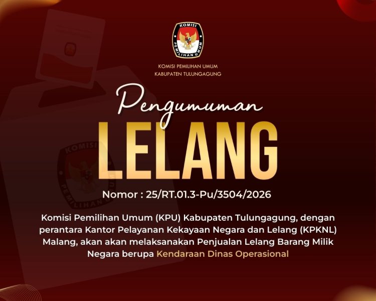 Komisi Pemilihan Umum (KPU) Kabupaten Tulungagung, dengan perantara Kantor Pelayanan Kekayaan Negara dan Lelang (KPKNL) Malang, akan akan melaksanakan Penjualan Lelang Barang Milik Negara berupa Kendaraan Dinas Operasional berupa (satu) unit Mini Bus Toyota Avanza 1.5 S Nopol AG 1070 RP