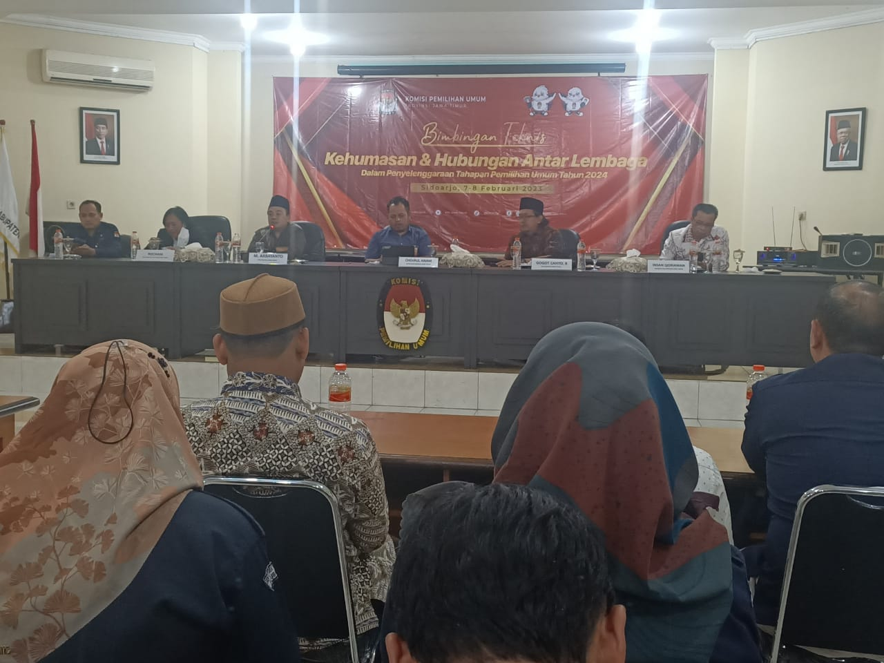 Sidoarjo (kab-tulungagung.kpu.go.id) KPU Kabupaten Tulungagung hadiri undangan Bimbingan Teknis (Bimtek) Kehumasan dan Hubungan Antar Lembaga dalam penyelenggaraan Pemilu 2024 bersama dengan KPU Kabupaten/Kota yang diselenggarakan oleh KPU Provinsi Jawa Timur, Selasa 7- 8 Pebruari 2023 bertempat di Kantor KPU Kabupaten Sidoarjo yang beralamatkan di Jalan Raya Cemegkalang Nomor 1 Sidoarjo dengan dihadiri oleh 38 KPU Kabupaten/Kota di Jawa Timur. Masing-masing terdiri dari Ketua, Anggota Divisi Sosdiklih, Parmas, dan SDM, dan Kepala Subbagian (Kasubbag) Teknis Penyelenggaraan Pemilu, Partisipasi, dan Hubungan Masyarakat.