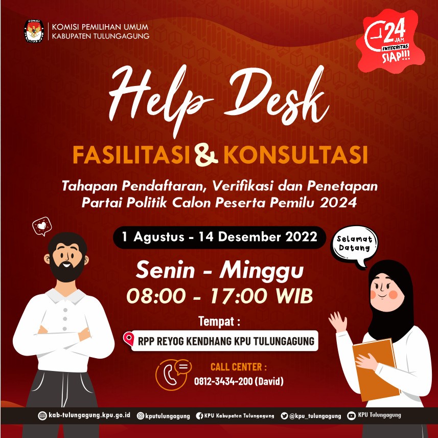 Koordinator harian Helpdesk KPU Kabupaten Tulungagung, Sutriono menjelaskan bahwa dalam menjalankan piket helpdesk, dirinya membagi tugas kepada dua orang setiap harinya, mulai hari Senin sampai dengan Minggu full, pukul 08.00 s/d 17.00 WIB. “Setiap selesai menjalankan tugas piket helpdesk, baik itu memberikan pelayanan dan konsultasi bagi parpol, kemudian setiap kehadirannya di laporkan melalui Bit.ly helpdesk KPU Provinsi Jawa Timur, dan bentuk layanan helpdesk juga kita laporkan kedalam Bit.ly, hal ini dilakukan untuk mempermudah pemantauan kegiatan pelayanan helpdesk di seluruh KPU Kabupaten/Kota se Jatim melalui Infografis Helpdesk, setiap hari pasti ada pergerakan kegiatan “, ungkap Sutriono.(Ipeh)