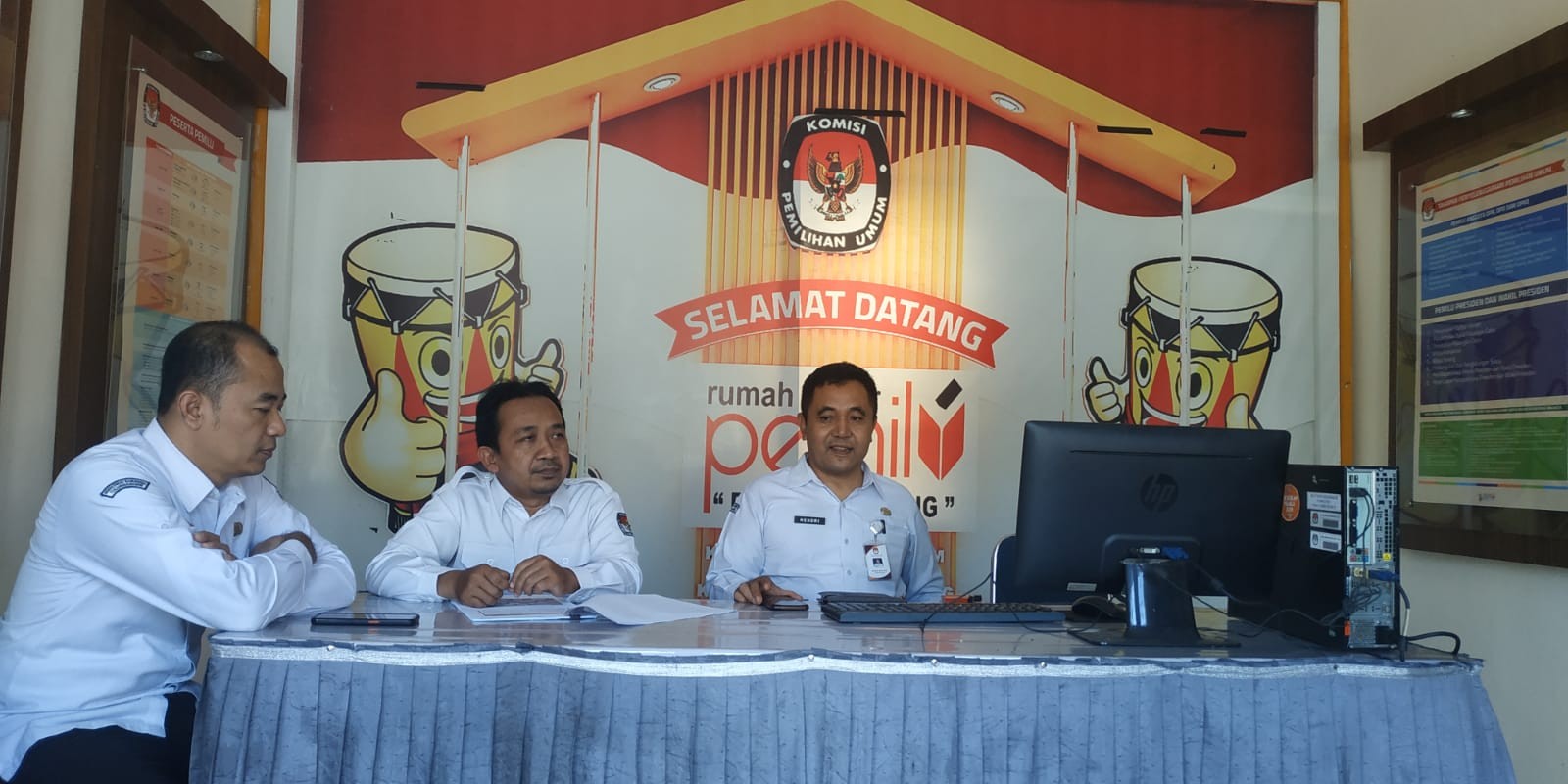 Anggota Komisioner KPU Tulungagung, Mochamad Arif, didampingi Sekretaris, Hendri Afrianto dan Kasubag Teknis, David Hartanto, menyampaikan arahan kepada petugas heldesk di hari pertama.(01/08/2022).