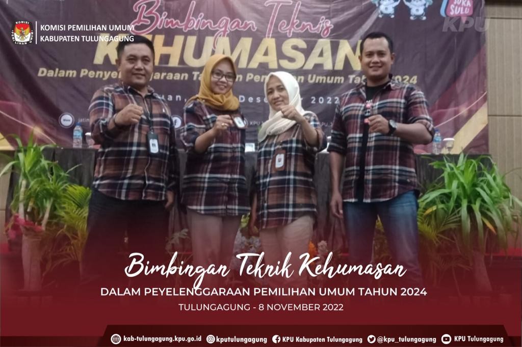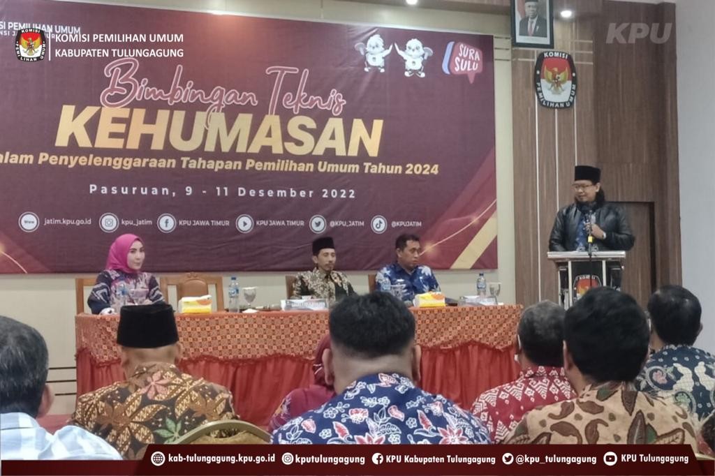 Pasuruan (kab-tulungagung.kpu.go.id) Bimbingan Teknis (Bimtek) Kehumasan dalam Penyelenggaraan Tahapan Pemilihan Umum Tahun 2024 digelar KPU Provinsi Jawa Timur di KPU Kabupaten Pasuruan pada hari Jum’at sampai dengan Minggu (9 -11/ 12/ 2022) Diikuti oleh sejumlah 152 orang yang terdiri dari Divisi Sosdiklih Parmas dan SDM, Sekretaris, dan dua orang staf yang membidangi kehumasan dari 38 KPU Kabupaten/Kota se-Jawa Timur. KPU Kabupaten Tulungagung hadir dalam kesempatan tersebut Divisi Sosdiklih Parmas dan SDM, Much. Amarodin, Hendri Afrianto selaku Sekretaris, Arie Kusumaningtyas selaku Bendahara dan Ifadianasari, Staff Subbag Tekmas KPU Kabupaten Tulungagung.