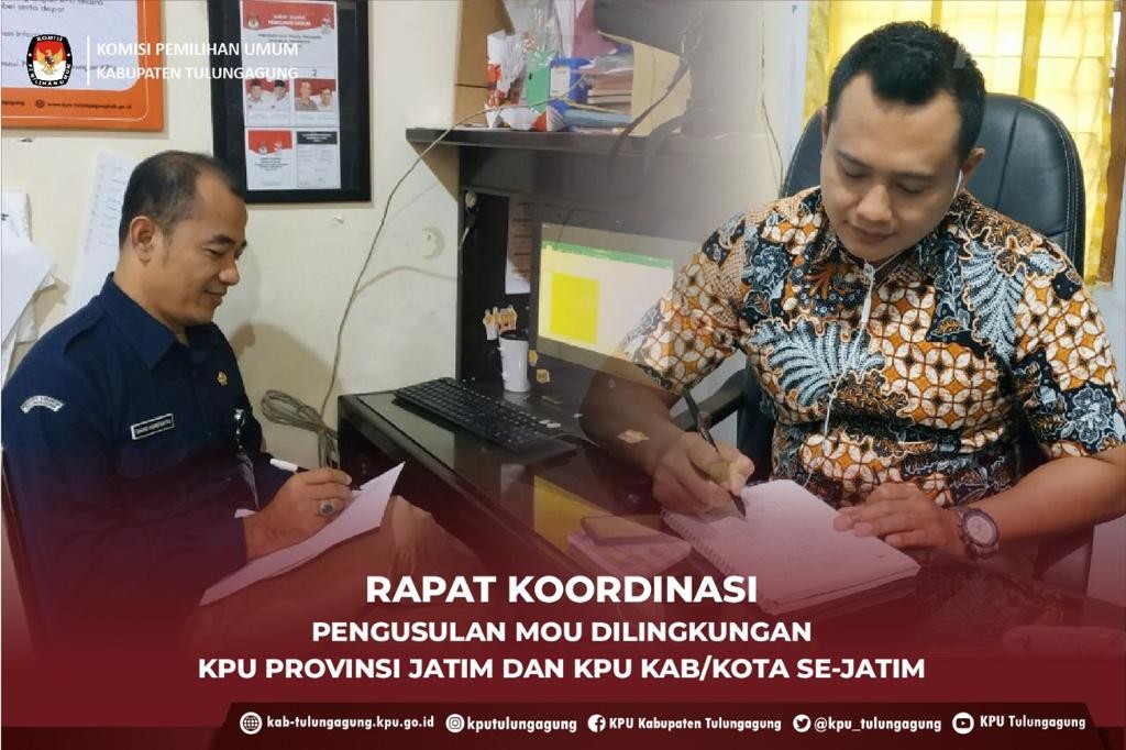 Tulungagung (kab-tulungagung.kpu.go.id) Menindaklanjuti kegiatan Rakor KPU Provinsi Jawa Timur tanggal 25 Mei 2022 dan tanggal 28 Juni 2022 perihal sosialisasi ketentuan MOU, rencana pelakssanaan MOU dan PKS dilingkungan KPU Jawa Timur, Jumat (5/8/2022) KPU Kabupaten Tulungagung menghadiri Rakor Persiapan Pengusulan Memorandum of Understanding (MOU) di lingkungan KPU Provinsi Jawa Timur secara daring bersama dengan 16 (enam belas) KPU Kabupaten/Kota yang mengusulkan MOU dengan pihak eksternal, hadir dalam acara rakor tersebut Ketua KPU, Ketua Divisi Sosdiklih Parmas dan SDM serta Kasubbag Teknis Penyelenggaraan Pemilu, Partisipasi dan Humas KPU Kabupaten Tulungagung.