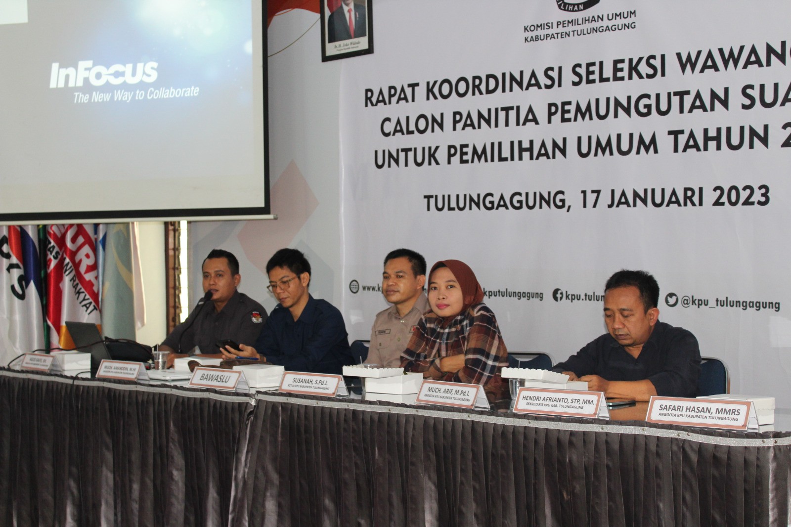 Rakor membahas persiapan pelaksanaan seleksi wawancara calon Panitia Pemungutan Suara (PPS), dibuka oleh Ketua KPU, Susanah, dan dihadiri Ketua Bawaslu, Fayakun, (17/01/2023)