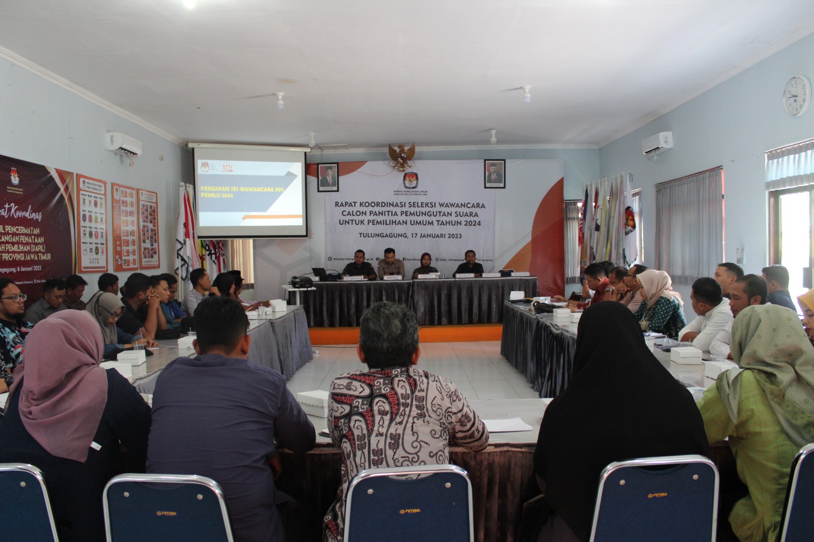 Tulungagung (kab-tulungagung.kpu.go.id) Persiapan menghadapi seleksi wawancara calon Panitia Pemungutan Suara (PPS) untuk Pemilihan Umum Tahun 2024, Komisi Pemilihan Umum Kabupaten Tulungagung Selasa (17/01/2023) mengadakan Rapat Koordinasi dengan PPK se Kabupaten Tulungagung. Hadir dalam acara tersebut Ketua beserta Anggota KPU Kabupaten Tulungagung, Ketua Bawaslu, Sekretaris KPU Kabupaten Tuungagung berserta Kasubag, Bertempat di ruang Media Center KPU Tulungagung.