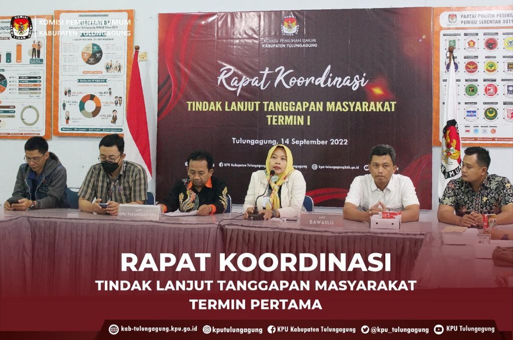 Dalam membuka acara Rapat Koordinasi persiapan tindak lanjut terhadap tanggapan masyarakat pada termin pertama. Ketua KPU Kabupaten Tulungagug, Susanah menyampaikan bahwa secara khusus rapat koordinasi pada malam hari ini secara khusus membahas tanggapan masyarakat selama termin pertama tanggapan masyarakat yang berakhir pada tanggal 14 September 2022 hari ini, dapat kami laporkan sebanyak 43 (empat puluh tiga) orang/ NIK masyarakat yang terdaftar sebagai keanggotaan Partai Politik, dengan rincian 33 terdaftar pada 14 parpol yang terdaftar dan ada kepengurusan di Kabupaten Tulungagung, sedangkan 10 orang/ NIK terdaftar pada 3 parpol yang tidak terdaftar dan tidak ada kepengurusan di Kabupaten Tulungagung, ungkapnya.