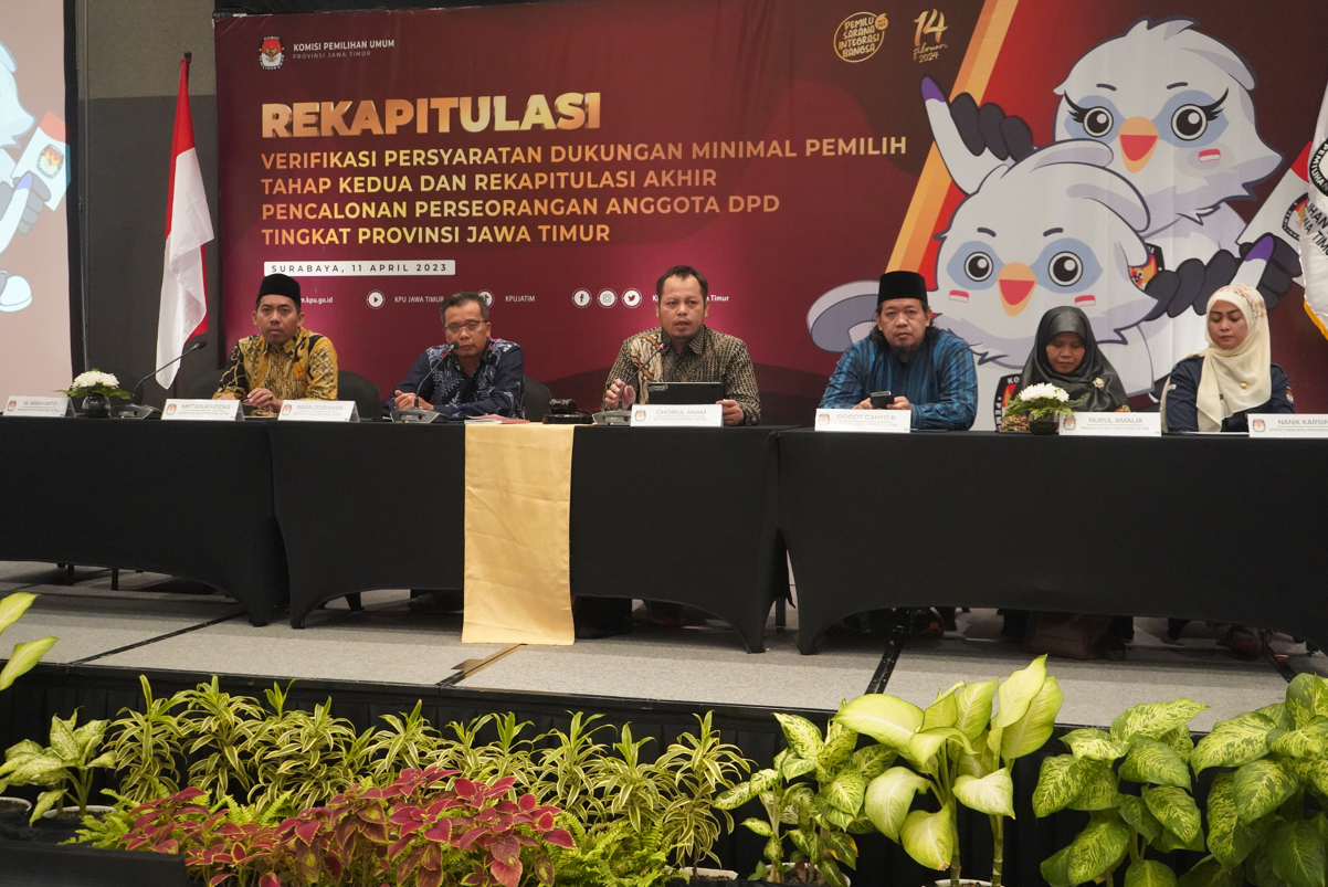 Sebanyak 20 Bacalon Anggota DPD telah melewati rangkaian panjang tahapan penyerahan dukungan minimal pemilih dan sebaran. Hingga Selasa (11/4/2023) kemarin tiba pada tahapan rekapitulasi verifikasi persyaratan dukungan minimal pemilih tahap kedua dan rekapitulasi akhir tingkat provinsi Jawa Timur. Hasilnya, 15 di antaranya dinyatakan memenuhi syarat dan 5 Bacaloan di nyatakan tidak memenuhi syarat.