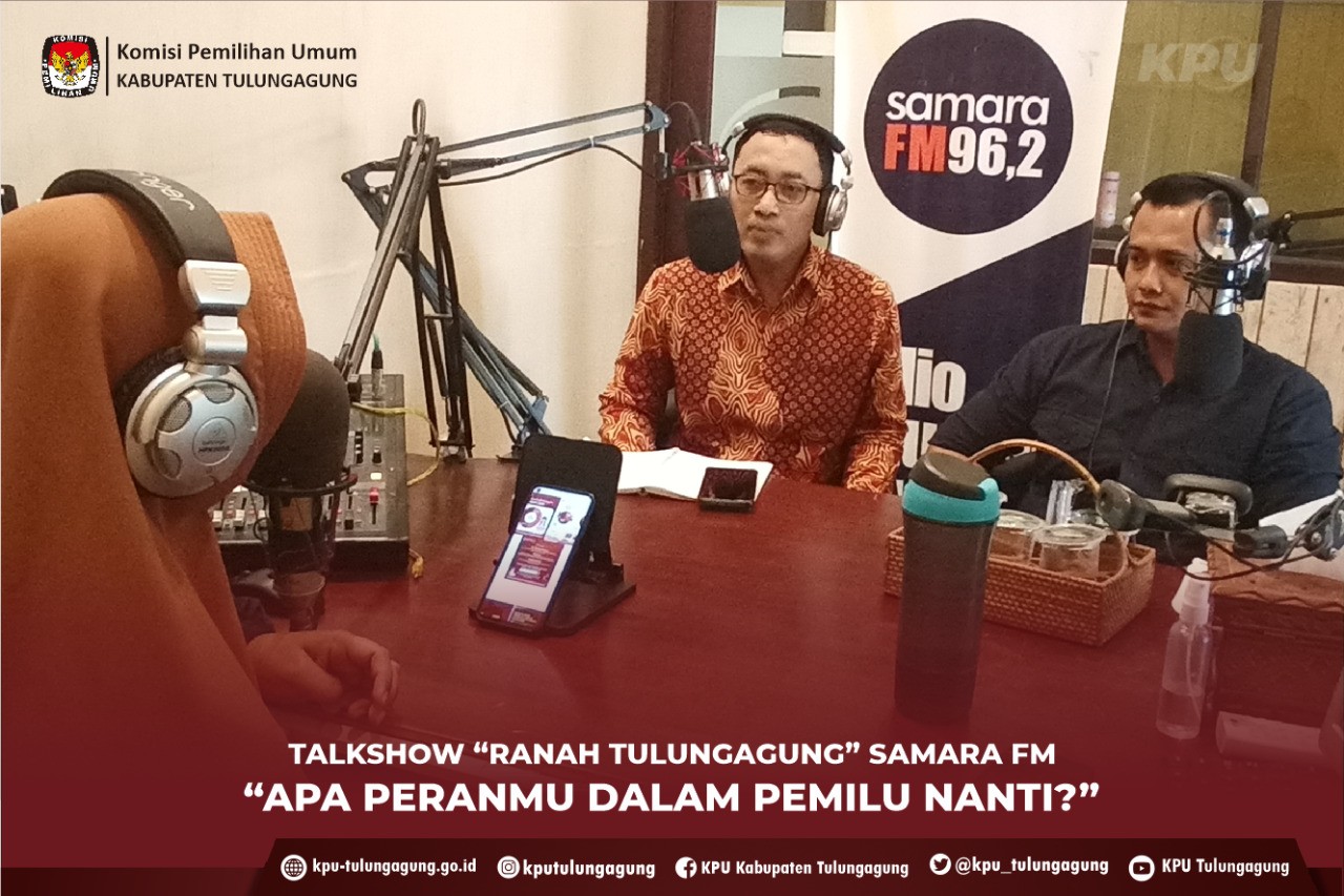 Tulungagung (kab-tulungagung.kpu.go.id) KPU Tulungagung Kembali hadir menyapa pendengar setia mitra Samara, dalam acara Talk Show Radio Ranah Publik Radio Samara FM Tulungagung. Rabu, (13/07/2022) dengan menghadirkan narasumber Anggota KPU, Much. Amarodin M.H.I, selaku Kordiv. Sosialisasi, Pendidikan Pemilih, Parmas dan SDM, dan Safari Hasan, MMRS, selaku Kordiv. Perencanaa Data dan Informasi. Dengan mengambil tema “ Apa Peranmu Dalam Pemilu Nanti?” dipandu radio announcer Lisa, acara Radio Talk Show Ranah Publik disiarkan pula secara On Air di 96,2 SAMARA FM. “Selamat pagii.. seluruh Mitra Samara…kembali lagi bersama saya Lisa yang akan menemani waktu anda semua dalam Ranah Publik, mitra Samara pasti penasaran donk siapa sih narasumber kita pada pagi hari in?...ucap Lisa awali talkshow.