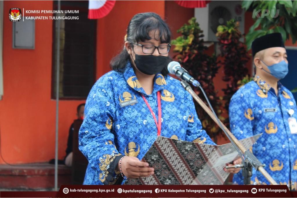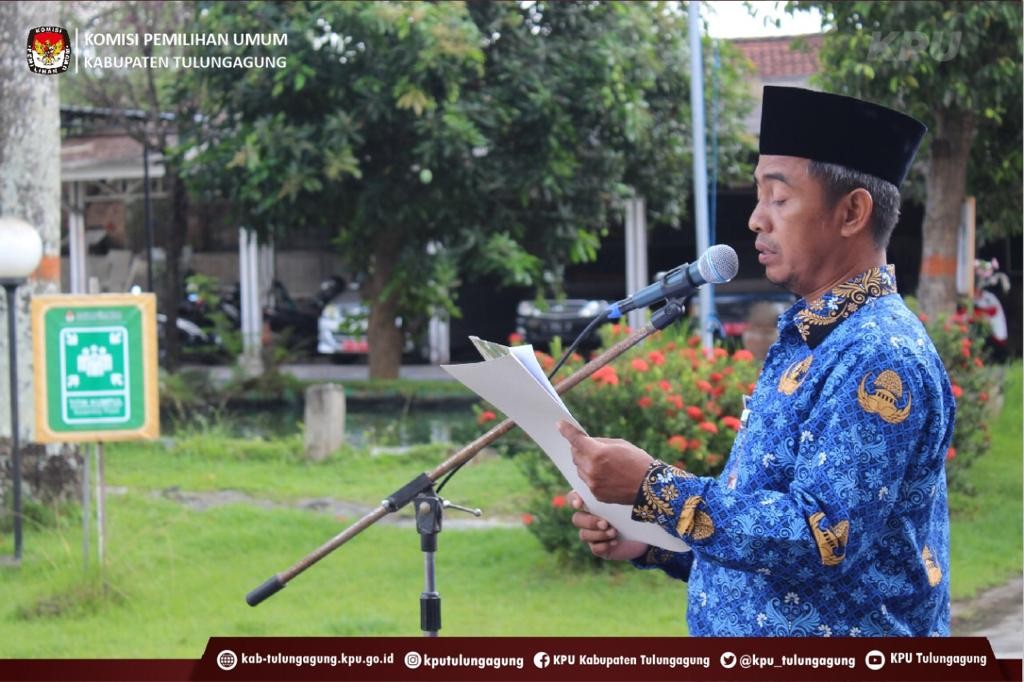 Ketua Komisi Pemilihan Umum Kabupaten Tulungagung, Susanah, S.Pd.I selaku inspektur upacara saat membacakan naskah sambutan Ketua KPU RI mengatakan bahwa Pelaksanaan Pemilu serentak tahun 2024 mendatang memiliki tantangan yang sangat kompleks, dari aspek teknis penyelenggaraan, ikhtiar untuk menhadirkan prosedur memilih yag mudah dan sederhana menjadi focus KPU sehingga kualitas partisipasi dapat ditingkatkan dan prosesntase suara tidak sah dapat diminimalisir. Dari aspek substansi tantangan mengahadapi maraknya disinformasi, praktek politik uang, dan penggunaan politik identitas yang dapat menyebabkan disintergrasi bangsa juga menjadi perhatian serius yang perlu dimitigasi sejak awal.