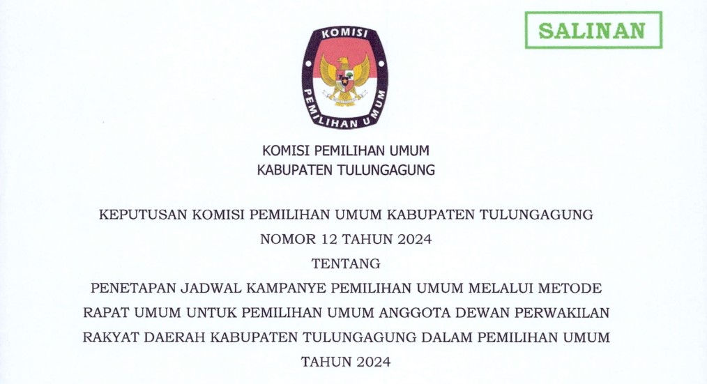 KEPUTUSAN KPU KAB. TULUNGAGUNG TENTANG PENETAPAN JADWAL KAMPAYE PEMILU METODE RAPAT UMUM ANGGOTA DPRD KAB. TULUNGAGUNG DALAM PEMILU TAHUN 2024 Sabtu, 20 Januari 2024 15:00 170 KLIK DISINI Bagikan: Dilihat 170 Kali.