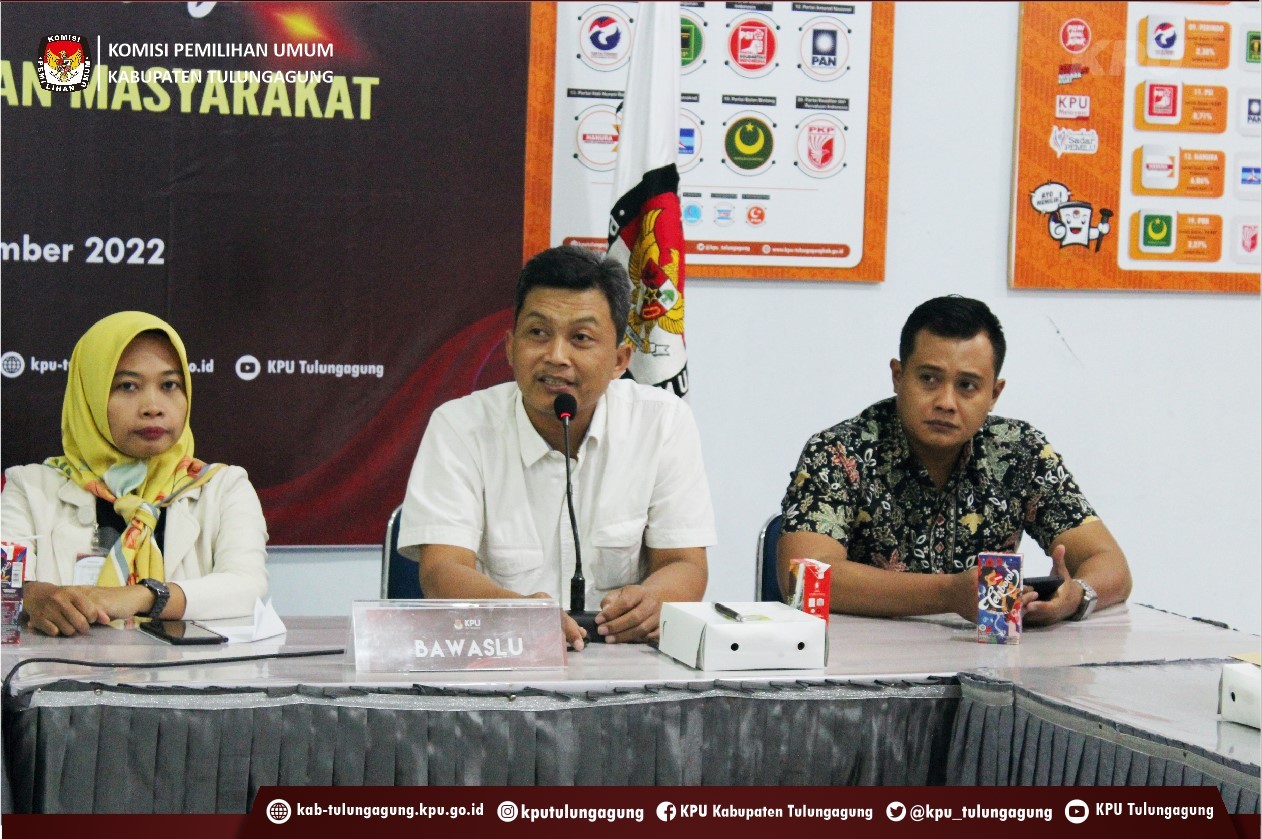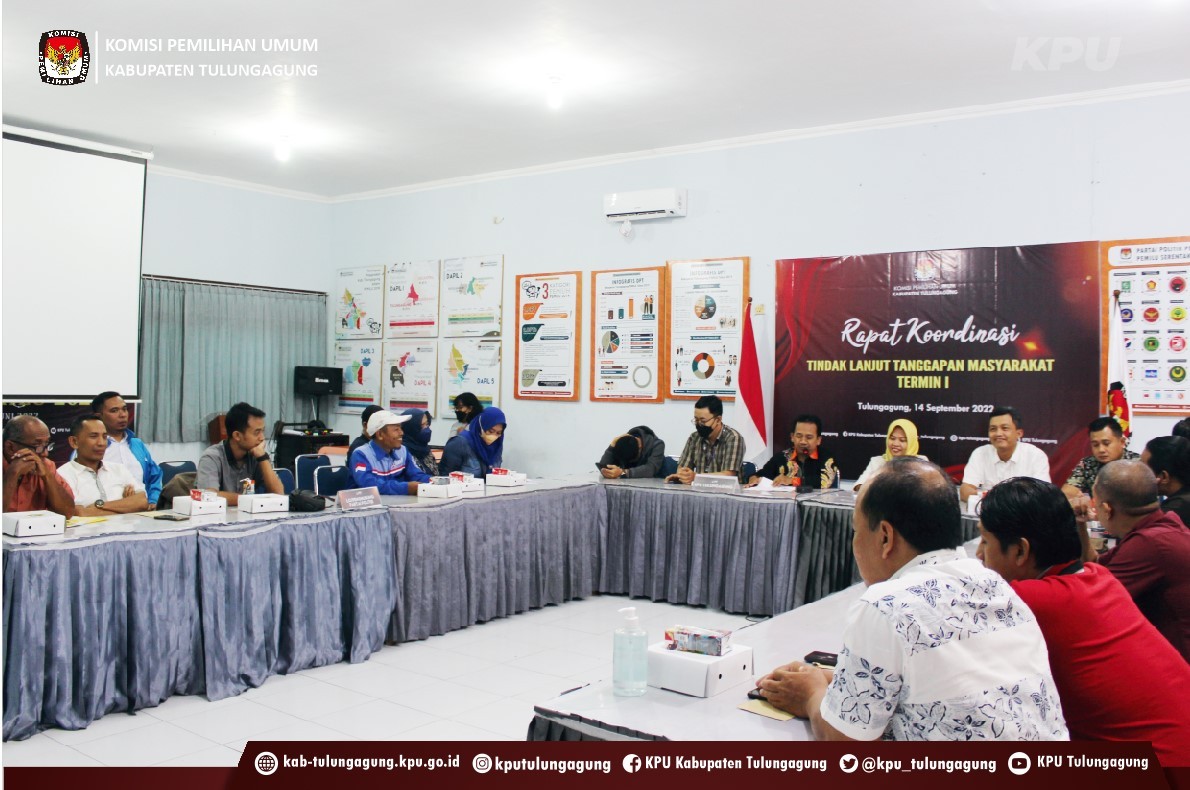 Tulungagung (kab-tulungagung.kpu.go.id) KPU Tulungagung mengundang Bawaslu serta seluruh partai politik calon peserta Pemilu 2024 di Kabupaten Tulungagung untuk Rapat Koordinasi Tindak Lanjut Tanggapan Masyarakt Termin I (1 Agustus - 14 September 2022) di Media Center KPU Tulungagung (14/09/2022)