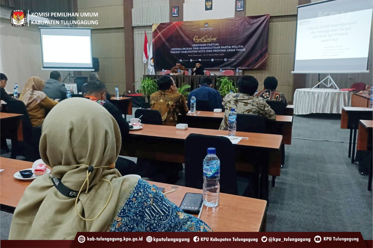 Pasuruan(kab-tulungagung.kpu.go.id) KPU Kabupaten Tulungagung ikuti Pembukaan Rapat Evaluasi Verfikasi Kepengurusan dan Keanggotaan Partai Politik Tingkat Kabupaten/ Kota dan Provinsi Jawa Timur di Kota Pasuruan, 11 November 2022.