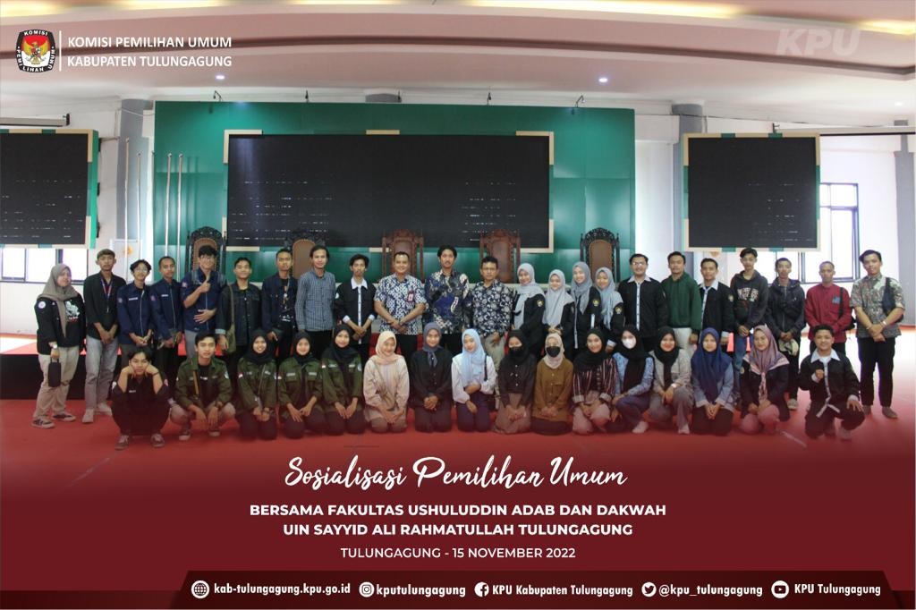Tulungagung (kab-tulungagung.kpu.go.id) – Anggota KPU Divisi Sosialisasi Pendidikan Pemilih, Partisipasi Masyarakat dan SDM, Much Amarodin menjadi narasumber dalam Sosialisasi Pemilihan Umum Bersama Mahasiswa Fakultas Ushuluddin Adab dan Dakwah UIN Sayyid Ali Rahmatullah Tulungagung. Sosialisasi yang dilaksanakan pada Selasa, 15 November 2022 lalu meminta KPU Kab.Tulungagung yang diwakili oleh Amar untuk memberikan materi seputar tahapan-tahapan Pemilu. Tahapan Pemilu sudah dilaksanakan oleh KPU sedari 18 bulan sebelum pelaksanaan Pemilu dan saat ini tahapan Pemilu sudah sampai pada tahapan rekruitmen Badan AdHoc. Amar juga menyampaikan bahwa partisipasi mahasiswa sebagai penyelenggara pemilu akan memberi pengalaman terjun langsung ke masyarakat. Dan bahwa sekecil apapun partisipasi kalian akan lebih baik dan akan merubah masa depan lima atau sepuluh tahun kedepan. Partisipasi kalian juga penting bagi suksesnya Pemilu 2024, baik sebagai penyelenggara, peserta pemilu, ataupun sebagai pemilih.