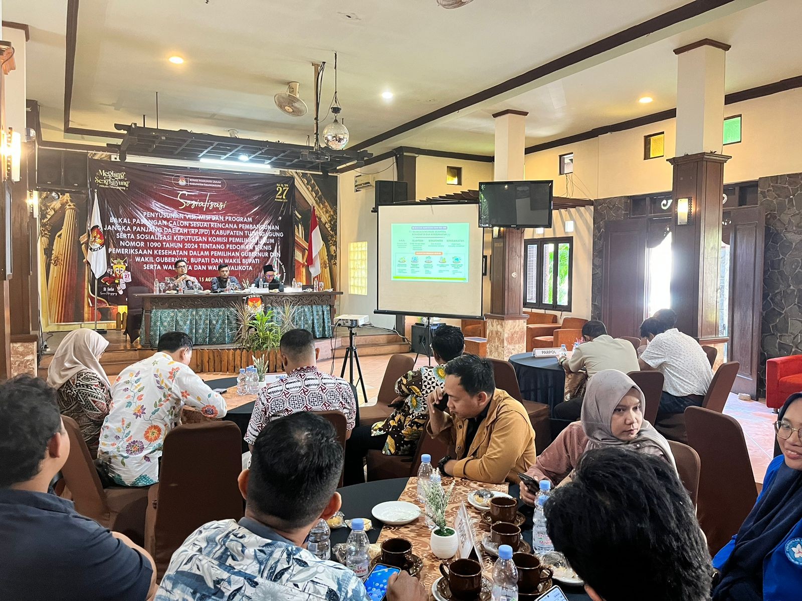 Tulungagung kab-tulungagung.kpu.go.id - KPU Kabupaten Tulungagung mengelar Sosialisasi Penyusunan Visi, Misi, dan Program Bakal Pasangan Calon Sesuai Rencana Pembangunan Jangka Panjang Daerah (RPJPD) Kabupaten Tulungagung serta Sosialisasi Keputusan Komisi Pemilihan Umum Nomor 1090 Tahun 2024 Tentang Pedoman Teknis Pemeriksaan Kesehatan Dalam Pemilihan Gubernur Dan Wakil Gubernur, Bupati Dan Wakil Bupati Serta Walikota Dan Wakil Walikota, Kamis, 15 Agustus 2024 di Barn Meeting and Convention.