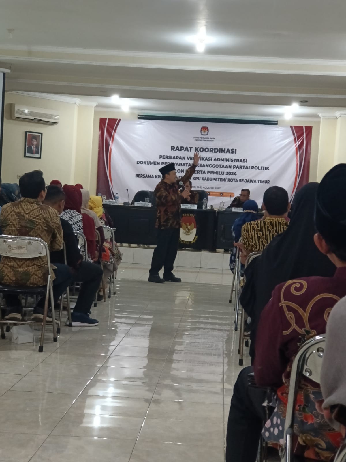 KPU Tulungagung menghadiri acara rapat koordinasi persiapan verifikasi administrasi dokumen persyaratan keanggotaan partai politik calon peserta pemilu 2024 bersama dengan KPU Kabupaten/Kota se Jawa Timur. (12-13/8/2022)