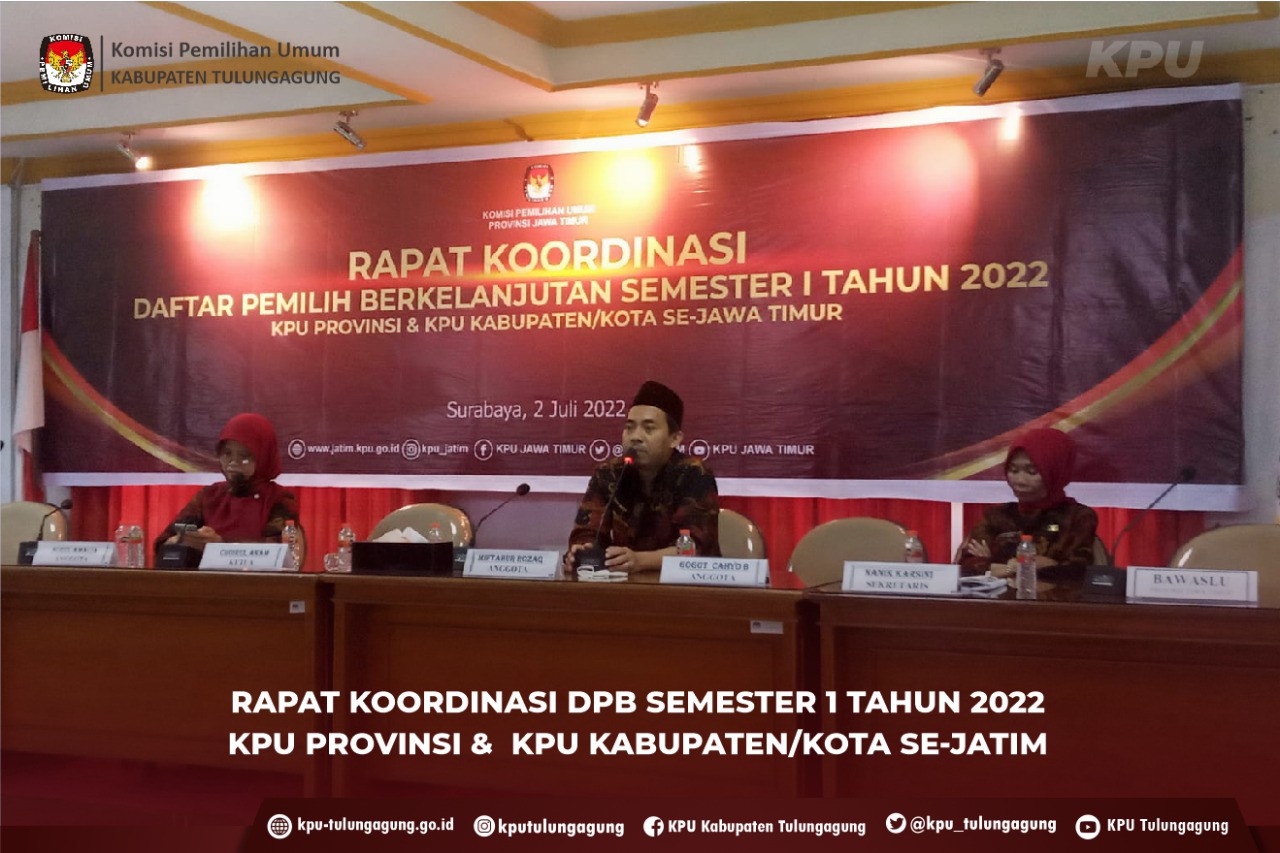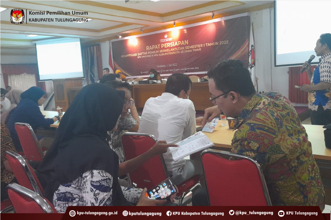 Tulungagung (kab-tulungagung.kpu.go.id) Anggota KPU Tulungagung dari Divisi Perencanaan, Data dan Informasi, Safari Hasan, Kasubbag Program dan Data, Aminah Widarti, serta operator SIDALIH, Bagus Wahyu Permana, hadir dalam Rapat Koordinasi Tindak Lanjut hasil Pemadanan Data Pemilih Berkelanjutan KPU Propinsi dan KPU Kabupaten Kota se-Jawa Timur di Surabaya (22/07/2022)