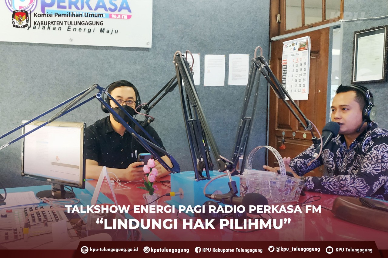 Tulungagung (kab-tulungagung.kpu.go.id) “Selamat pagii…kawan Perkasa, hadir kembali bersama saya Maulida dalam energi pagi Perkasa FM …Nyalakan Energi Pagimu….”sapa Host cantik di suasana mendung pagi ini, Rabu (06/07/2022). On Air di 96,8 Perkasa FM, KPU Kabupaten Tulungagung sapa kawan Perkasa bersama Narasumber Much. Amarodin, M.H.I selaku Kordiv Sosialisasi Pendidikan Pemilih, Parmas dan SDM dan Safari Hasan, MMRS., selaku Kordiv Perencanaan Data dan Informasi, dengan tema yang diambil adalah “ Lindungi Hak Pilihmu”.