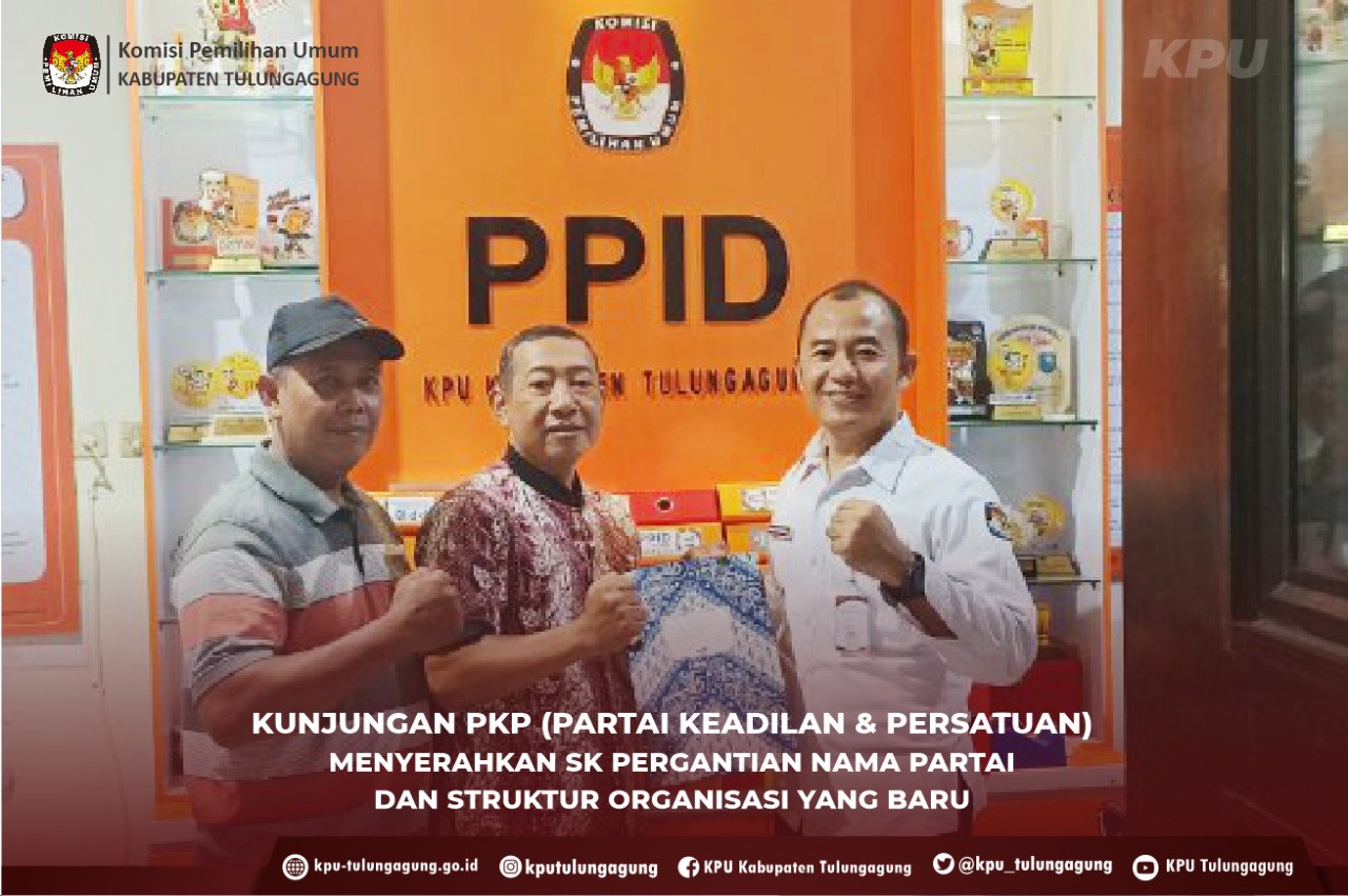 Tulungagung (kab-tulungagung.kpu.go.id) Pengurus DPK Kabupaten Tulungagung Partai Keadilan dan Persatuan (PKP) mendatangi kantor KPU Kabupaten Tulungagung, Senin, (4/07/2022) untuk melakukan kegiatan silaturahmi dan koordinasi terkait persiapan tahapan verifikasi partai politik peserta pemilu tahun 2024. Kegiatan ini wajib dilaksanakan oleh Pengurus partai politik di tingkat Kabupaten maupun Kota karena merupakan instruksi langsung dari DPP. “Benar hari ini kami bersama dengan pengurus tingkat Kabupaten mendatangi Kantor KPU Kabupaten Tulungagung untuk menyerahan SK Kepengurusan Partai PKP di Tingkat Kabupaten, kami antar secara langsung sekaligus untuk bersilahturahmi dan koordinasi persiapan verifikasi partai politik peserta pemilu 2024“, ujar Wigih selaku Sekretaris DPK PKP Kabupaten Tulungagung.