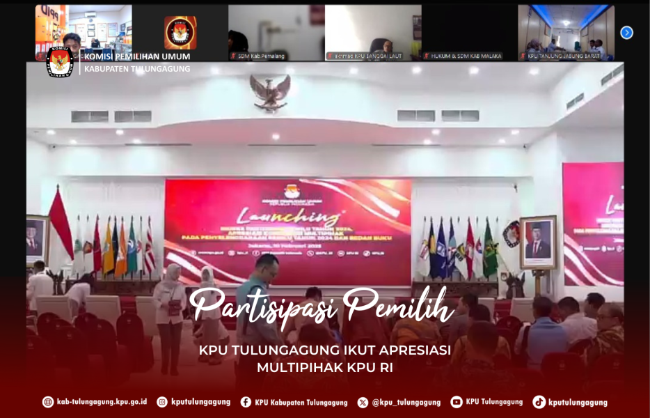 Tulungagung, 10 Februari 2025 (https://kab-tulungagung.kpu.go.id/) – Komisi Pemilihan Umum (KPU) Republik Indonesia menggelar kegiatan Apresiasi Kontribusi Multipihak dan Bedah Buku yang berlangsung di Ruang Sidang Utama KPU, Jakarta, pada Senin (10/2). Acara ini turut diikuti oleh seluruh KPU kabupaten/kota se-Indonesia, termasuk KPU Tulungagung yang mengikuti kegiatan secara daring melalui Zoom Meeting.