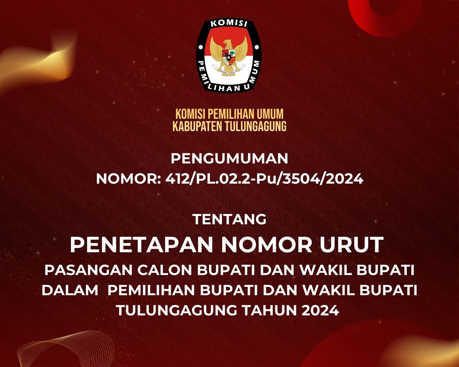 PENETAPAN NOMOR URUT PASANGAN CALON BUPATI DAN WAKIL BUPATI DALAM PEMILIHAN BUPATI DAN WAKIL BUPATI TULUNGAGUNG TAHUN 2024 Senin, 23 September 2024 22:00 123 UNDUH DISINI Bagikan: Dilihat 123 Kali.