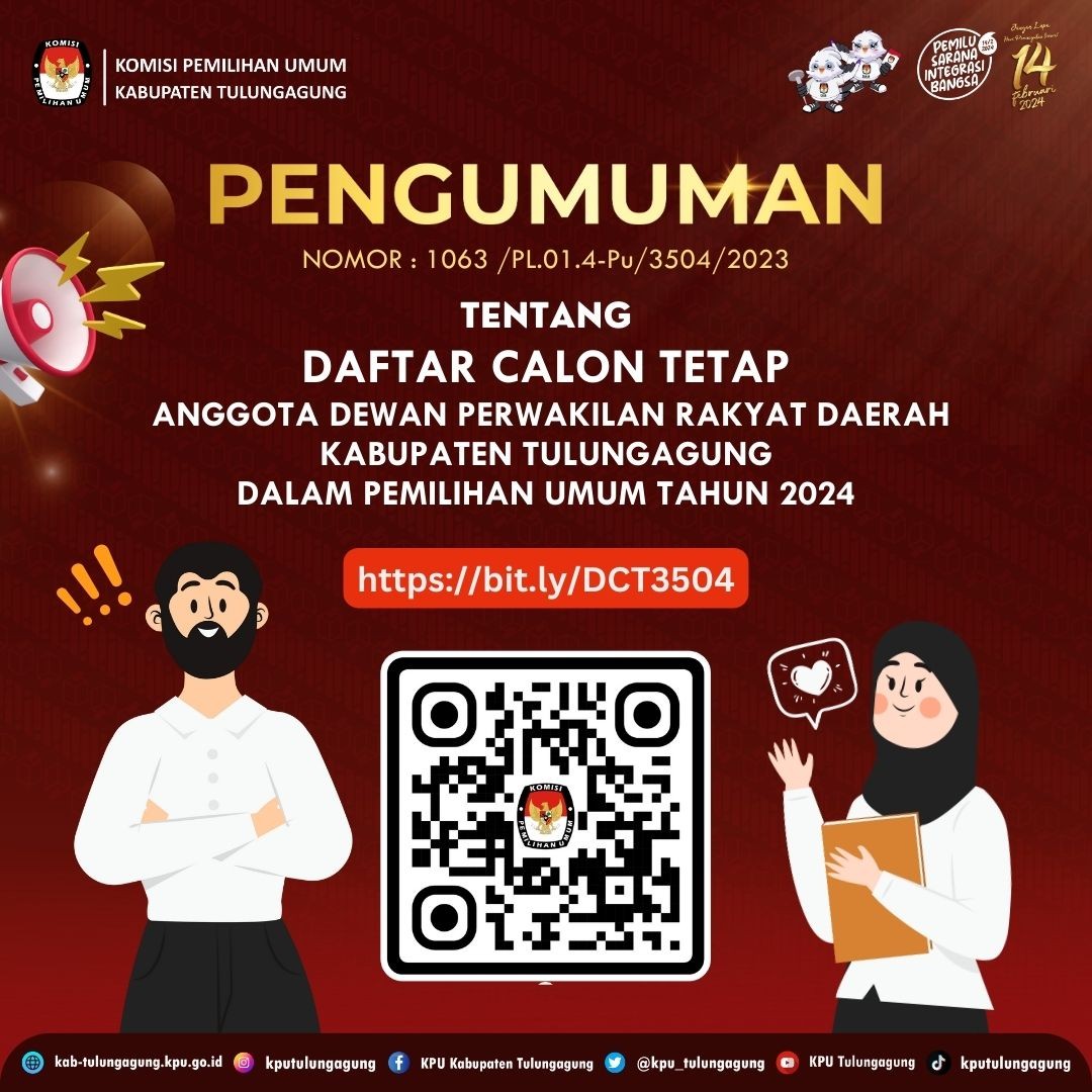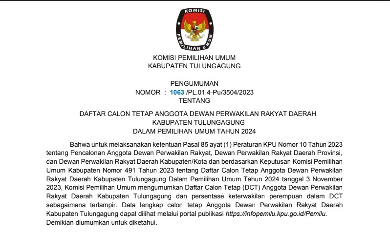 Pengumuman Daftar Calon Tetap (DCT) Anggota DPRD Kabupaten Tulungagung Sabtu, 04 November 2023 07:00 2404 Pengumuman DCT Keputusan KPU Kabupaten Tulungagung Nomor 491 Tahun 2023 tentang Daftar Calon Tetap Anggota DPRD Pemilu Tahun 2024 BERITA ACARA PENETAPAN DAFTAR CALON TETAP ANGGOTA DPRD KABUPATEN TULUNGAGUNG Bagikan: Dilihat 2,404 Kali.