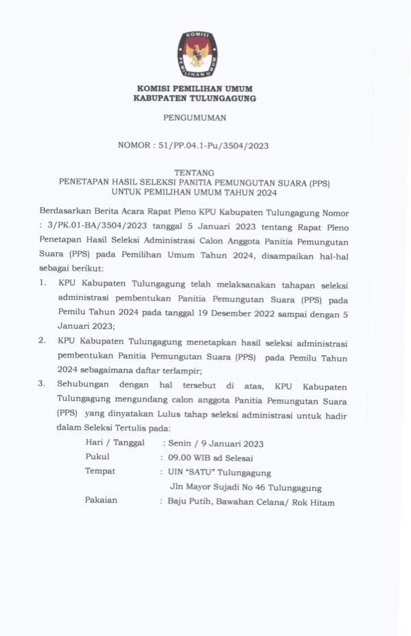 PENGUMUMAN: HASIL SELEKSI ADMINISTRASI CALON ANGGOTA PPS PEMILU 2024