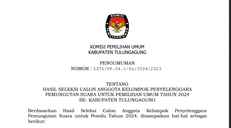 Pengumuman Hasil Seleksi Calon Anggota KPPS untuk Pemilu Tahun 2024 se-Kabupaten Tulungagung Selasa, 30 Januari 2024 07:00 301 KLIK DISINI Bagikan: Dilihat 301 Kali.