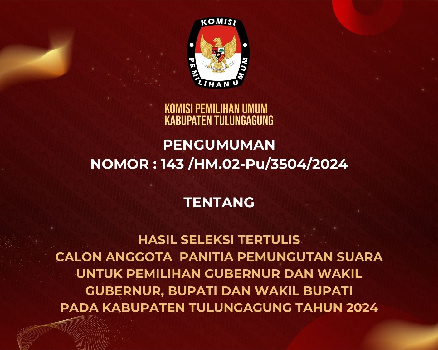 Pengumuman Hasil Seleksi Tertulis PPS PILKADA Tahun 2024 Senin, 20 Mei 2024 21:00 524 KLIK DISINI UNTUK MELIHAT PENGUMUMAN LEBIH JELAS Bagikan: Dilihat 524 Kali.