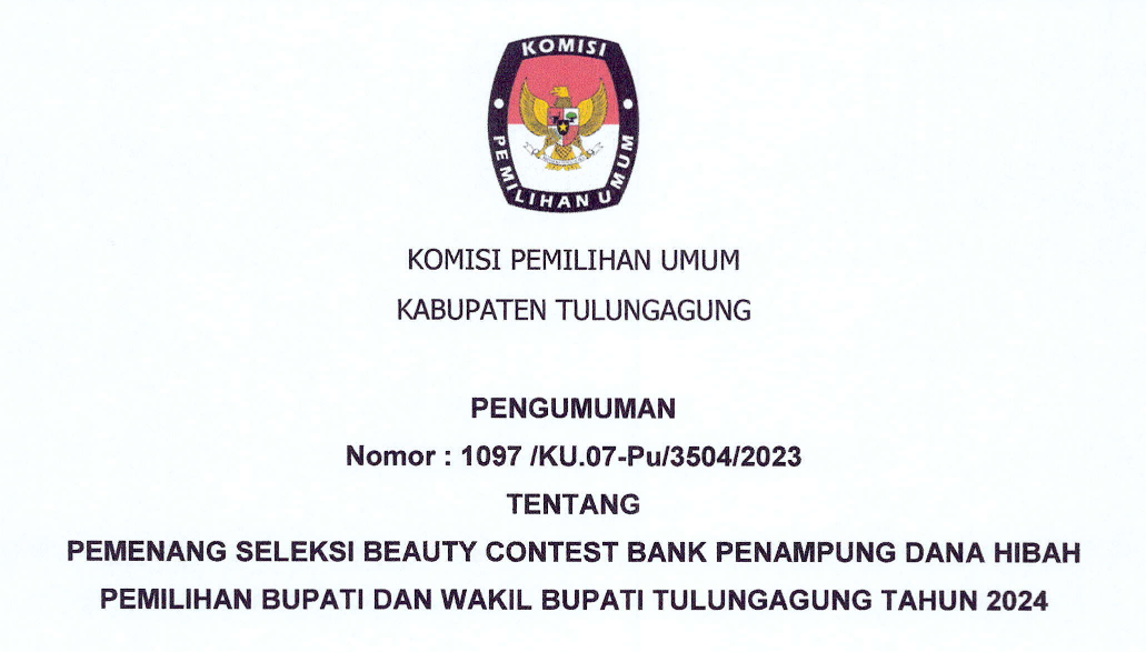PENGUMUMAN: Pemenang Seleksi Beauty Contest Bank Penampung Dana Hibah Pilkada 2024 Jumat, 10 November 2023 16:10 75 UNDUH DISINI Bagikan: Dilihat 75 Kali.