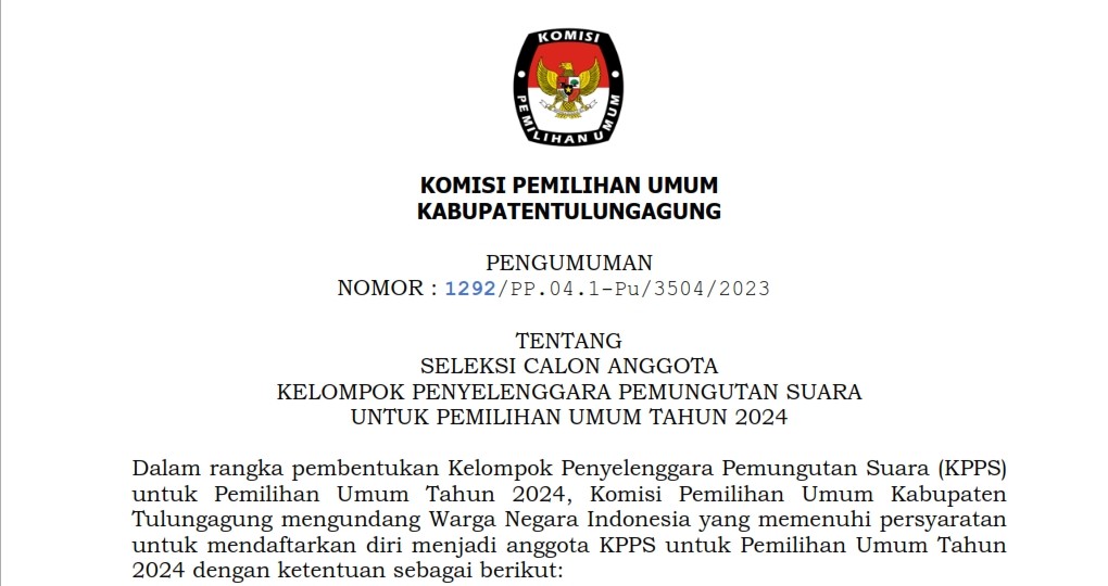 PENGUMUMAN PENDAFTARAN KPPS DI KABUPATEN TULUNGAGUNG Senin, 11 Desember 2023 01:00 1152 UNDUH PENGUMUMAN DISINI UNDUH FORMULIR PENDAFTARAN DISINI UNDUH FORMULIR KHUSUS PPS DISINI Bagikan: Dilihat 1,152 Kali.