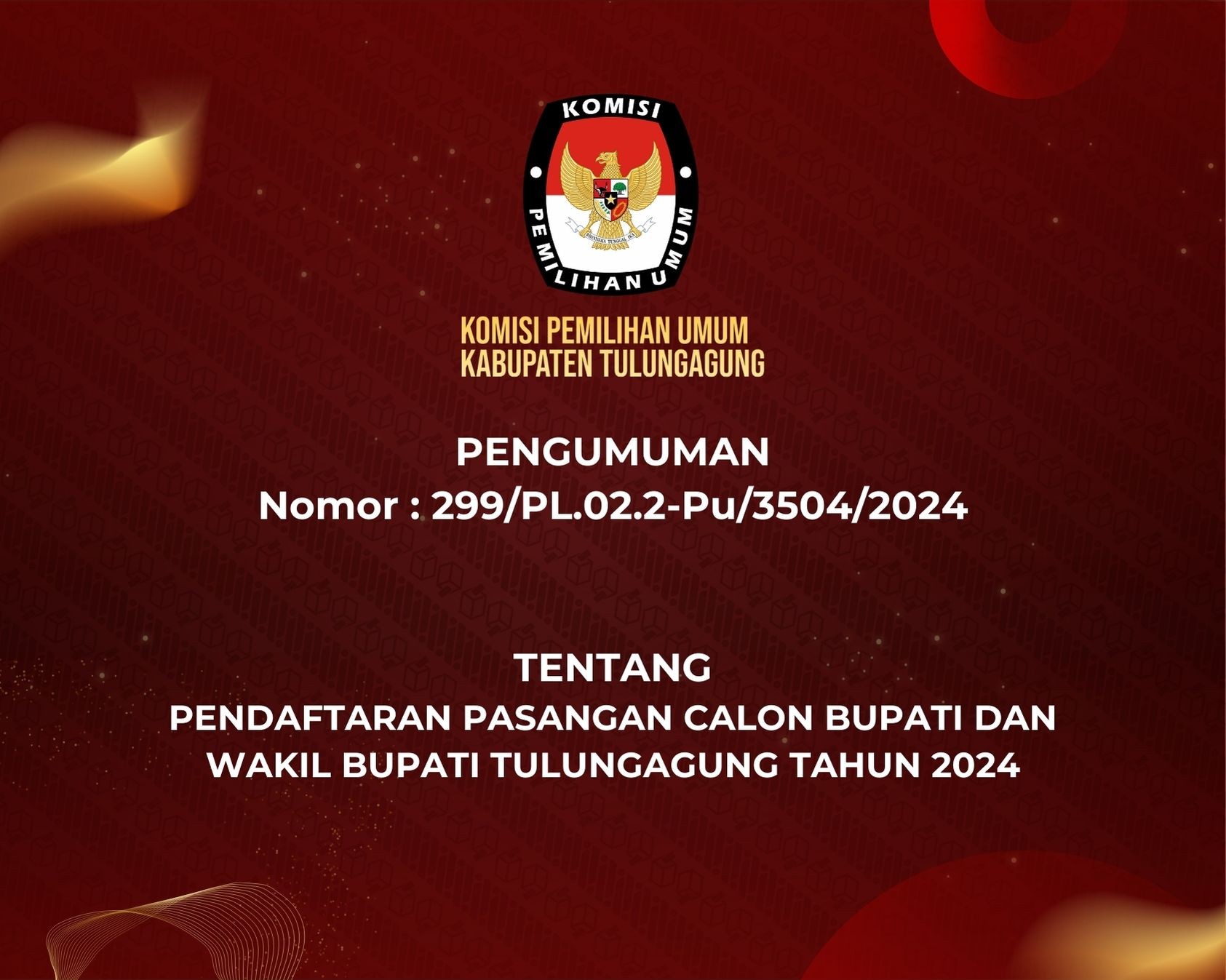 PENGUMUMAN PENDAFTARAN PASANGAN CALON BUPATI DAN WAKIL BUPATI TULUNGAGUNG TAHUN 2024 Sabtu, 24 Agustus 2024 14:00 549 UNDUH DISINI FORM PERMOHONAN AKSES SILON : KLIK DISINI Bagikan: Dilihat 549 Kali.