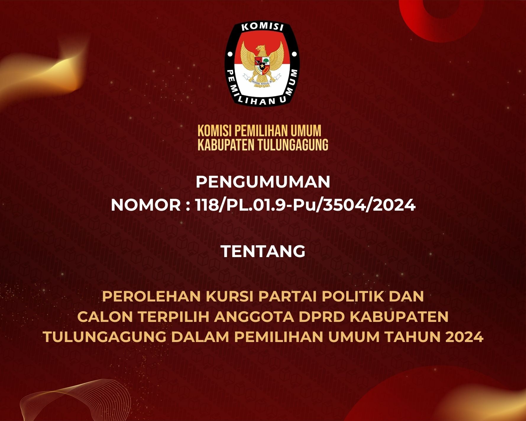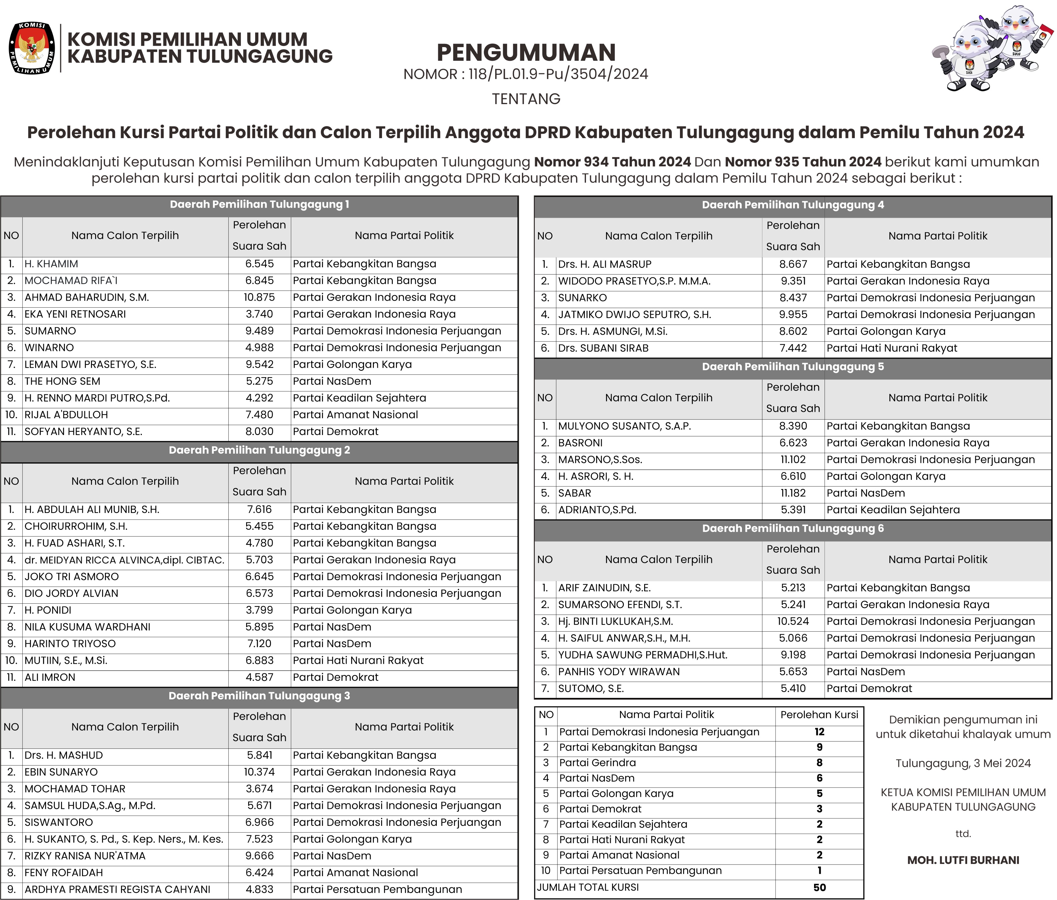 Pengumuman Perolehan Kursi Parpol dan Calon Terpilih DPRD Kabupaten Tulungagung Pemilu 2024 Jumat, 03 Mei 2024 07:00 204 KLIK DISINI UNTUK MELIHAT PENGUMUMAN LENGKAPNYA Bagikan: Dilihat 204 Kali.