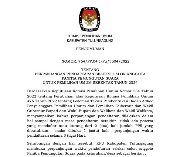 PENGUMUMAN: PERPANJANGAN PENDAFTARAN PPS PEMILU 2024 Sabtu, 31 Desember 2022 07:00 948 PENGUMUMAN: PERPANJANGAN PENDAFTARAN PPS PEMILU 2024 Unduh disini. Bagikan: Dilihat 948 Kali.