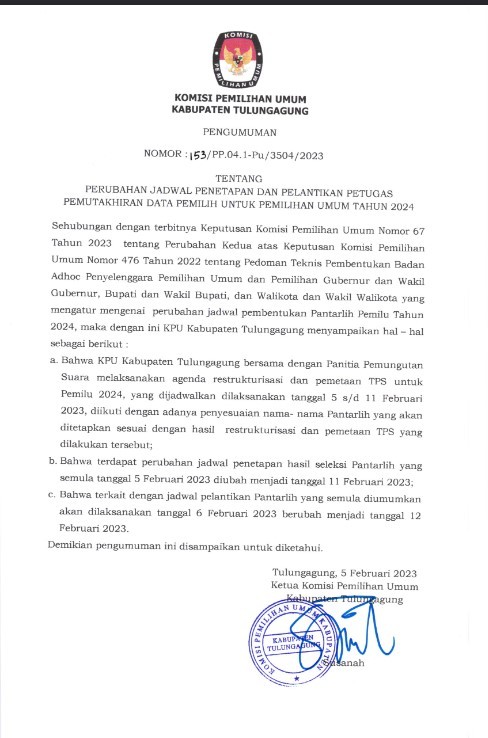 PENGUMUMAN: PERUBAHAN JADWAL PENETAPAN DAN PELANTIKAN PANTARLIH