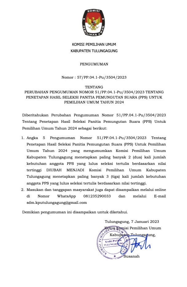 PENGUMUMAN: PERUBAHAN PENGUMUMAN HASIL SELEKSI ADMINISTRASI CALON PPS PEMILU 2024.