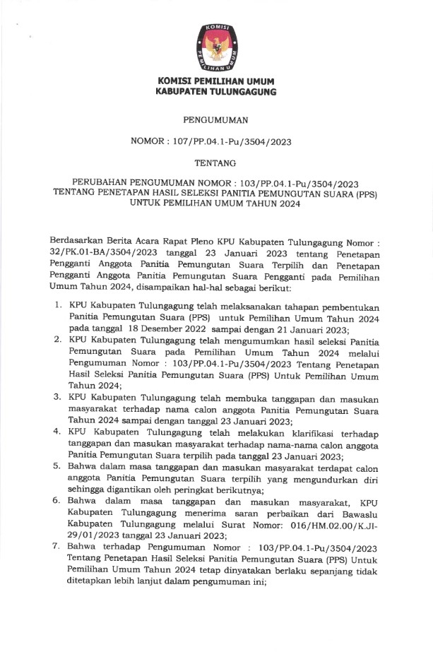 PENGUMUMAN: PERUBAHAN PENGUMUMAN HASIL SELEKSI PANITIA PEMUNGUTAN SUARA PEMILU 2024.