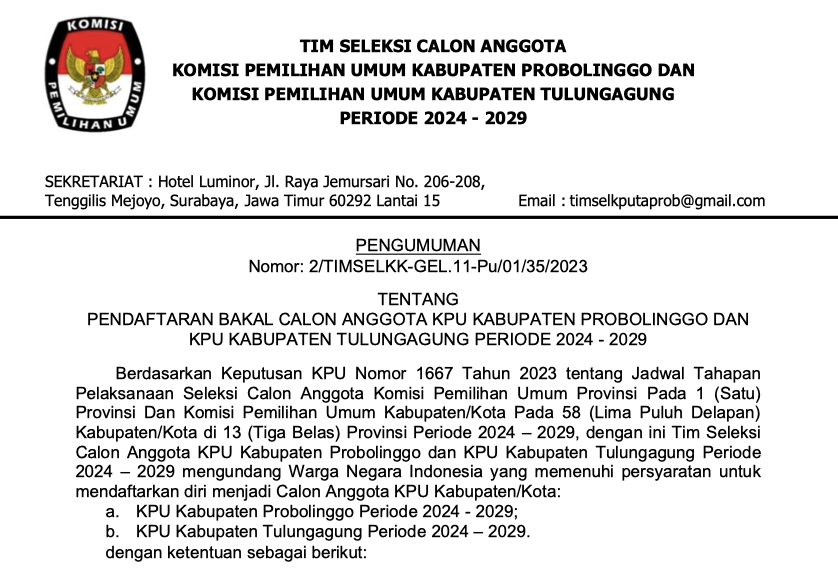 PENGUMUMAN SELEKSI CALON ANGGOTA KPU TULUNGAGUNG 2024-2029 Minggu, 26 November 2023 10:15 527 UNDUH DISINI Bagikan: Dilihat 527 Kali.