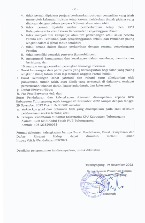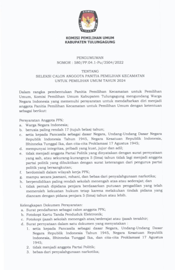 PENGUMUMAN: SELEKSI CALON ANGGOTA PANITIA PEMILIHAN KECAMTAN UNTUK PEMILU TAHUN 2024 Minggu, 20 November 2022 00:01 2348 File Pengumuman dapat diunduh disini. Untuk format formulir pendaftaran dapat diunduh disini. Bagikan: Dilihat 2,348 Kali.
