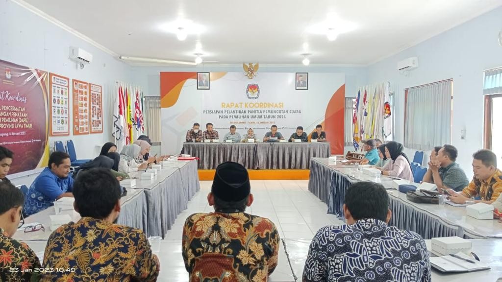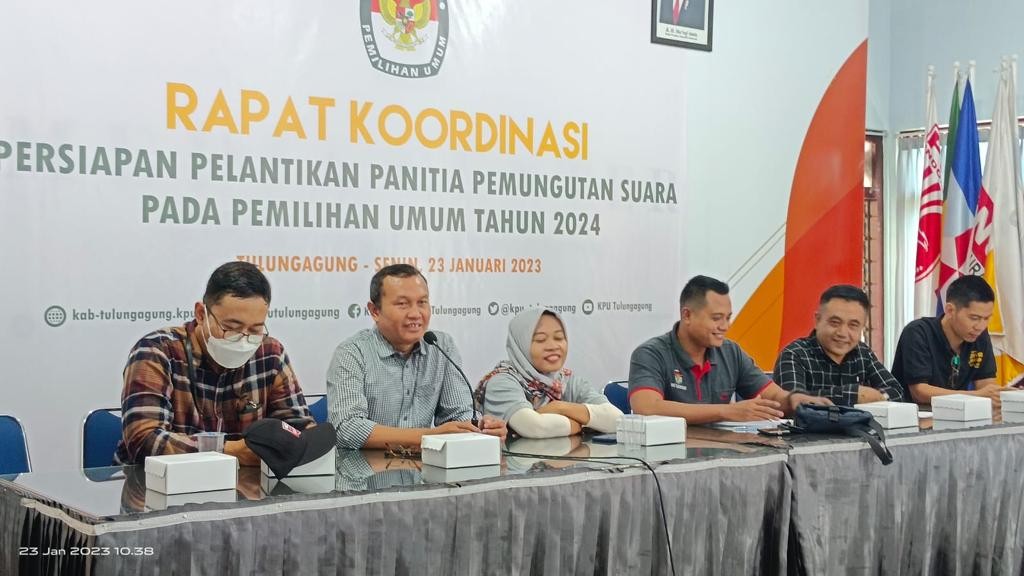 Persiapan menghadapi acara pelantikan Calon Paniti Pemungutan Suara (PPS) untuk pemilihan umum tahun 2024, Komisi Pemilihan Umum Kabupaten Tulungagung Senin (23/01/2023) mengadakan Rapat Koordinasi dengan ketua PPK se Kabupaten Tulungagung. Hadir dalam acara tersebut Ketua beserta Anggota KPU Kabupaten Tulungagung, Ketua Bawaslu, Sekretaris KPU Kabupaten Tulungagung berserta Kasubag, Bertempat di ruang Media center KPU Tulungagung.