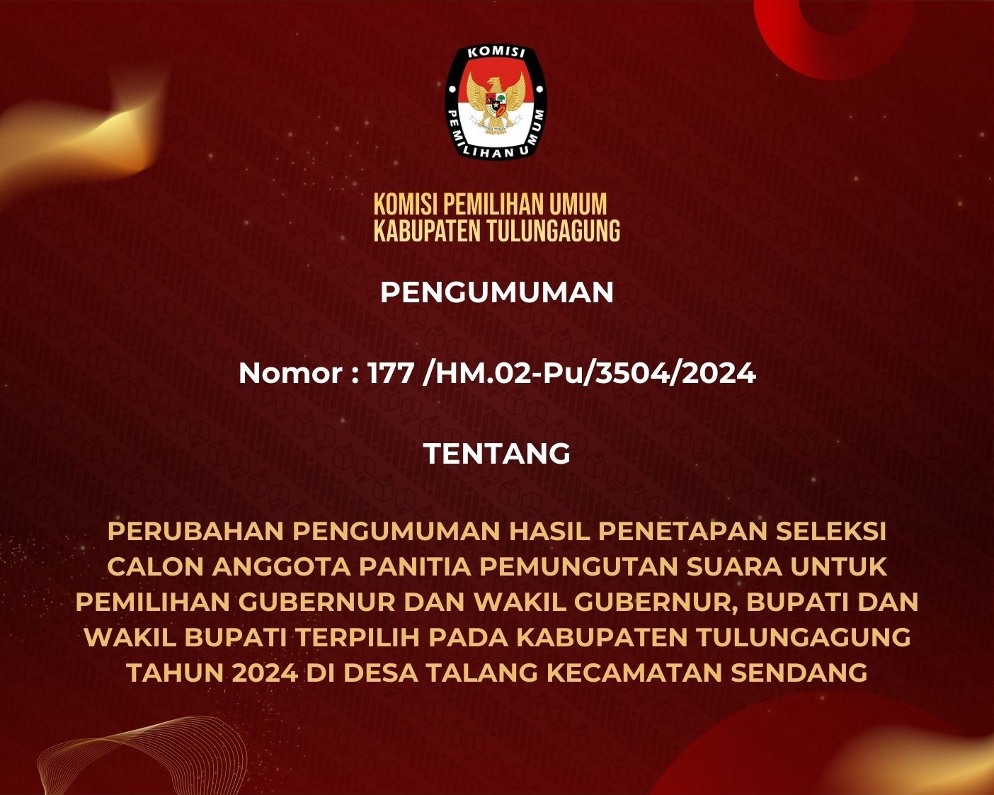 PERUBAHAN PENGUMUMAN HASIL PENETAPAN SELEKSI PPS PILKADA TAHUN 2024 DI DESA TALANG KECAMATAN SENDANG Sabtu, 25 Mei 2024 21:00 331 KLIK DISINI UNTUK MELIHAT PENGUMUMAN SELENGKAPNYA Bagikan: Dilihat 331 Kali.