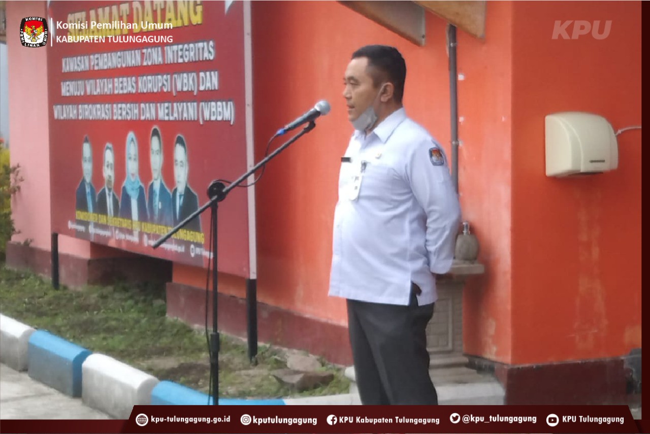 Hendri Afrianto, Sekretaris KPU Tulungagung sebagai pembina apel Senin pagi. (18/07/2022)