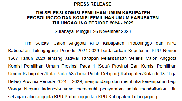 PRESS RELEASE TIM SELEKSI KPU KAB. PROBOLINGGO DAN KPU KAB. TULUNGAGUNG PERIODE 2024 - 2029 Senin, 27 November 2023 10:00 147 KLIK DISINI UNTUK UNDUH PRESS RELEASE Bagikan: Dilihat 147 Kali.