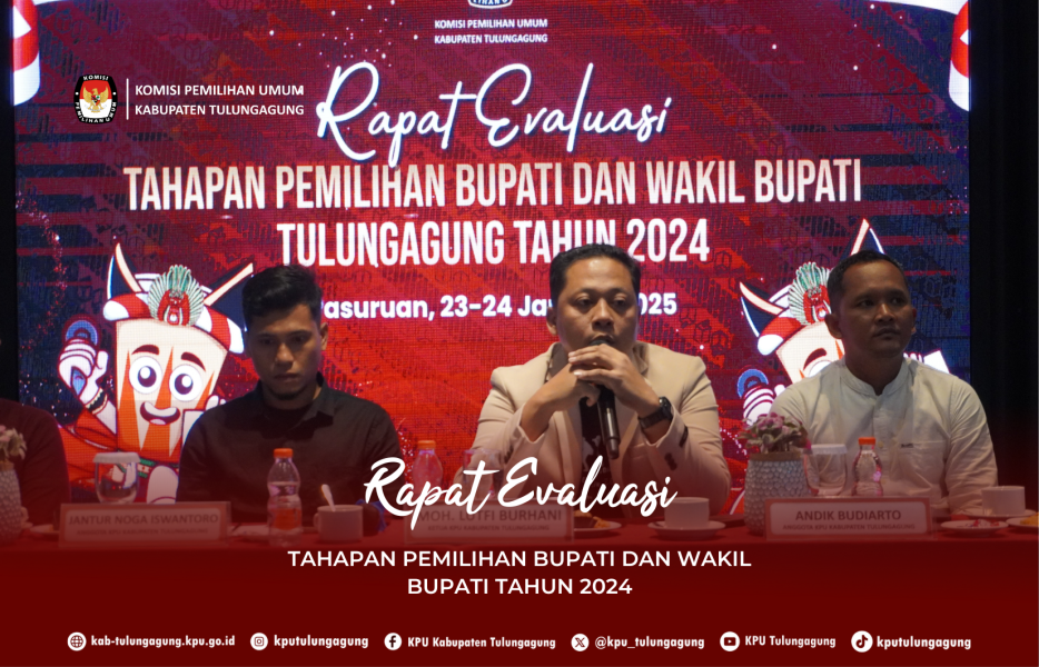 Pasuruan, (https://kab-tulungagung.kpu.go.id/) 24 Januari 2025 – Komisi Pemilihan Umum (KPU) Tulungagung mengadakan rapat evaluasi tahapan Pemilihan Bupati dan Wakil Bupati Tulungagung 2024. Acara yang berlangsung pada tanggal 23-24 Januari 2025 di Pasuruan ini dihadiri oleh PPK, jajaran KPU Tulungagung, dan perwakilan dari Bankesbangpol.
