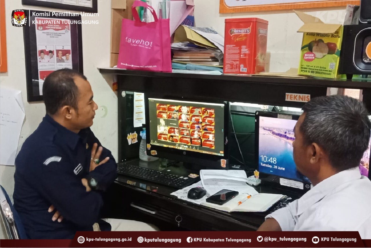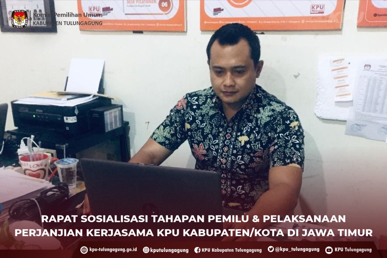 Tulungagung (kab-tulungagung.kpu.go.id) Selasa, (28/06/2022) Divisi SosDiklih Parmas dan SDM dan Kasubbag Teknis Penyelenggaraan Pemilu dan Humas KPU Kabupaten Tulungagung bersama dengan 38 (tigapuluh delapan) KPU Kabupaten/Kota se Jawa Timur menghadiri undangan rapat KPU Provinsi Jawa Timur melalui Zoom Meeting persiapan menghadapi kegiatan Sosialisasi Tahapan Pemilu dan Pelaksanaan Perjanjian Kerjasama KPU Kabupaten/Kota Se Jawa Timur.