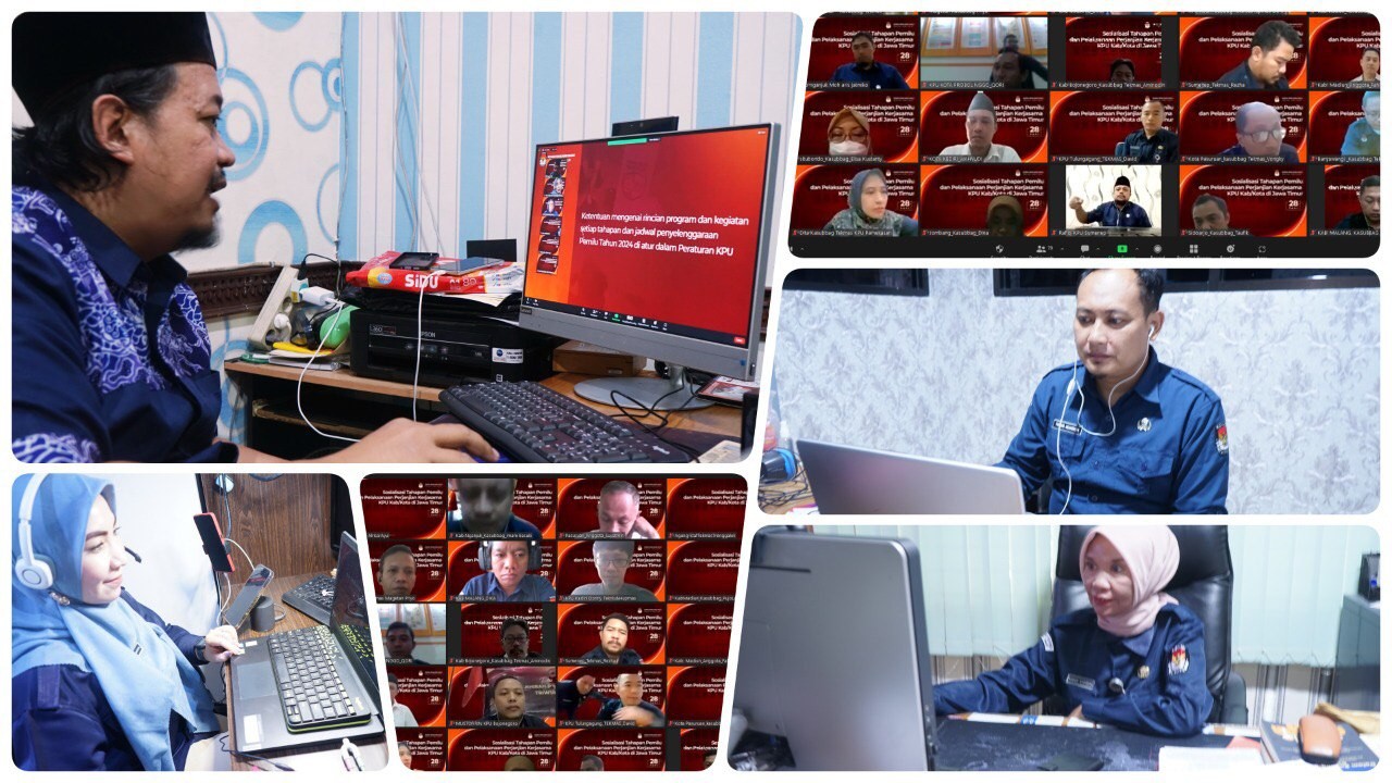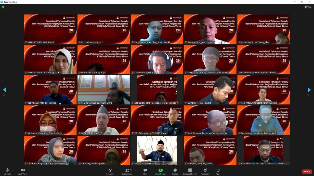RAPAT SOSIALISASI TAHAPAN PEMILU DAN PELAKSANAAN PERJANJIAN KERJASAMA KPU KABUPATEN/KOTA SE JATIM DIGELAR MELALUI ZOOM MEETING