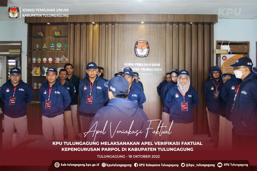 ‘’Hari ini sengaja kami kumpulkan seluruh tim verifikator faktual dalam ruangan mengingat situasi di halaman kantor masih turun hujan, jadi kami mengadakan apel bersaa di dalam ruangan yang penting tidak mengurangi makna‘’, terang Hendri. Menurut Hendri selaku Sekretaris KPU Kabupaten Tulungagung sekaligus memimpin apel bersama kesiapan menghadapi verifikasi faktual kepengurusan dan keanggotaan partai politik calon peserta pemilu 2024 dalam rangka melihat kesiapan, kekuatan personil tim verifikator yang akan diterjunkan di lapangan. Apakah sudah mendapatkan perlengkapan dan kelengakapan verfak, seperti jaket, topi, tanda pengenal, tas, jas hujan dan ATK laina, ucapnya.
