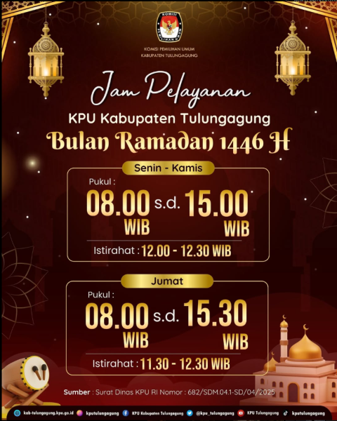 Tulungagung (https://kab-tulungagung.kpu.go.id/) – Memasuki bulan Ramadhan 1446 H/2025 M, Komisi Pemilihan Umum (KPU) Kabupaten Tulungagung menyesuaikan jam kerja pegawai sesuai dengan Surat Edaran Sekretaris Jenderal KPU Republik Indonesia Nomor: 682/SDM.04.1-SD/04/2024 tanggal 26 Februari 2025 tentang Jam Kerja pada Bulan Ramadhan 1446 H/2025 M.