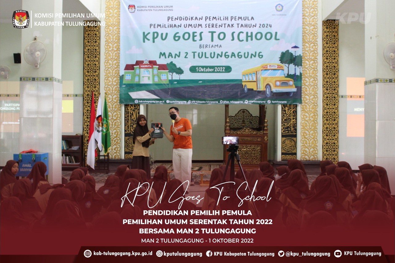 Tulungagung (kab-tulungagung.kpu.go.id) – Berbagai kegiatan Sosialisasi terus menerus dilakukan oleh Komisi Pemilihan Umum Kabupaten Tulungagung dalam rangka meningkatkan partisipasi kehadiran pemilih pemula dalam pelaksanaan Pemilu dan Pemilihan Serentak Tahun 2024, Komisi Pemilihan Umum Kabupaten Tulungagung mengadakan kegiatan Pendidikan Pemilih “ Goes To School” bersama Sekolah Menengah Atas di Kabupaten Tulungagung. Pada kesempatan kali ini kegiatan pendidikan pemilih pemula dilaksanakan di Madrasah Aliyah Negeri (MAN) 2 Tulungagung. Acara yang telah diselenggarakan pada Sabtu, 1 Oktober 2022 itu menghadirkan Safari Hasan (Anggota KPU Kabupaten Tulungagung, Divisi Perencanaan Data dan Informasi) sebagai pemateri dan 400 siswa MAN 2 Tulungagung.