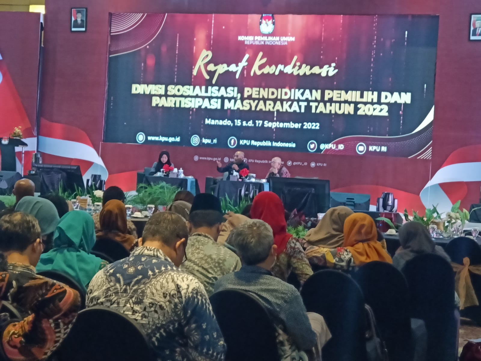 Manado (kab-tulungagung.kpu.go.id) Dalam rangka meningkatkan partisipasi masyarakat dan mendukung tahapan Penyelenggaraan Pemilu Serentak Tahun 2024, KPU RI laksanakan Rapat Koordinasi Divisi Sosialisasi, Pendidikan Pemilih, dan Partisipasi Masyarakat Tahun 2022 yang berlangsung di kota Manado. Dalam kesempatan tersebut, KPU Kabupaten Tulungagung hadir Komisioner Divisi Sosdiklih Parmas dan SDM, Much. Amarodin dan Kasubbag Teknis Penyelenggaraan Pemilu, Partisipasi dan Humas, David Hartanto. Juga diiktuti oleh 1.007 peserta dari KPU Provinsi/ KIP Aceh dan KPU/ KIP Kabupaten/ Kota se Indonesia selama 3 (tiga) hari mulai tanggal 15 sampai dengan 17 September 2022.